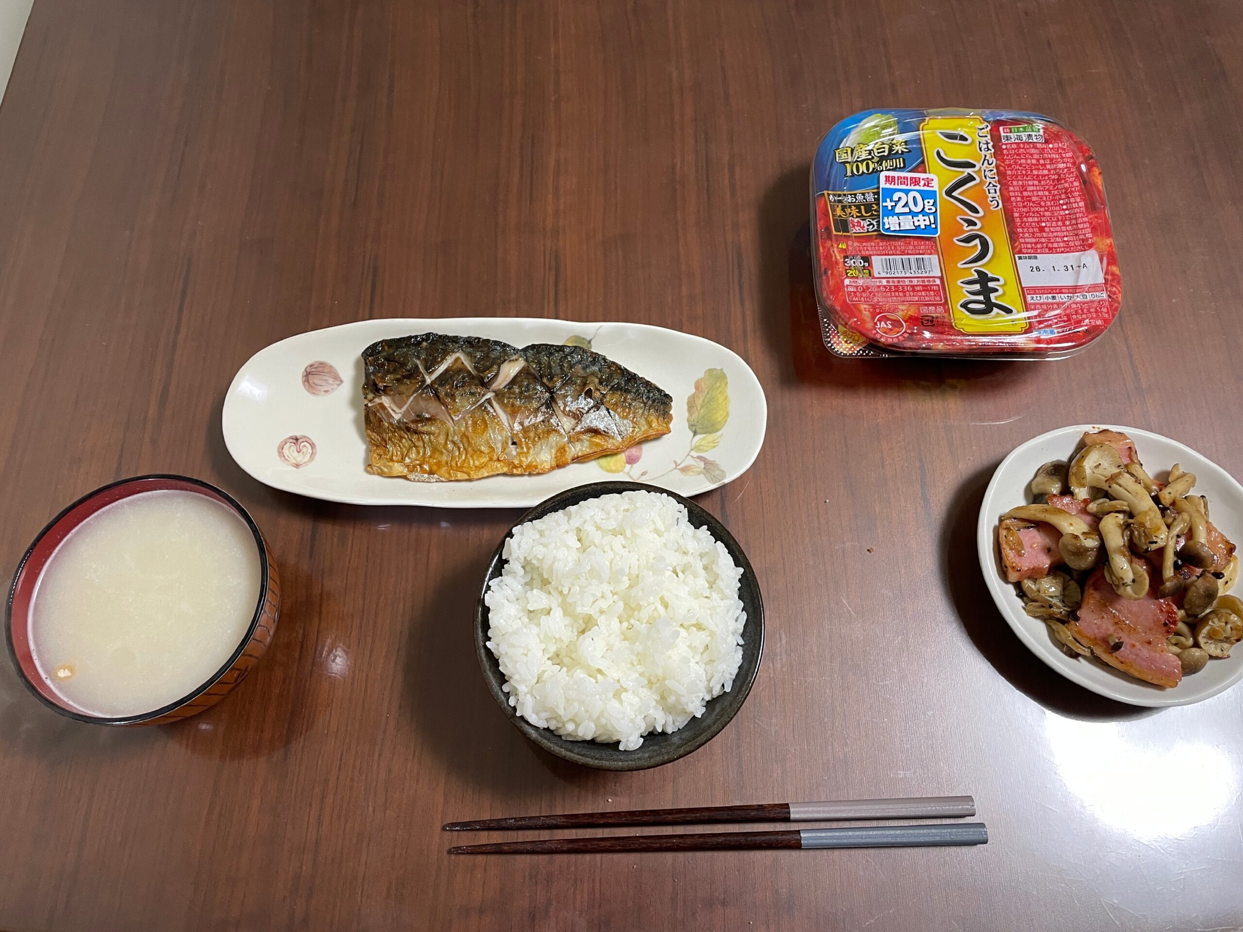 今日のお昼は久々に自宅でしたので、サバの塩焼きと、残っていたブロックベーコン